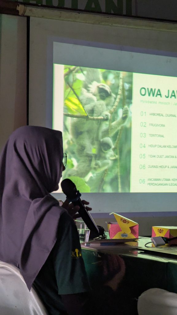 Materi edukasi disampaikan oleh Rahayu Oktaviani, Direktur Yayasan KIARA, yang memaparkan tentang biologi, perilaku, peran ekologis, serta berbagai ancaman yang dihadapi Owa Jawa. Salah satu peran penting yang disoroti adalah fungsi owa sebagai penyebar biji alami, yang membantu proses regenerasi hutan. Melalui pergerakan hariannya di kanopi hutan dan kebiasaan memakan buah, owa berkontribusi langsung dalam menjaga keberlanjutan ekosistem hutan.