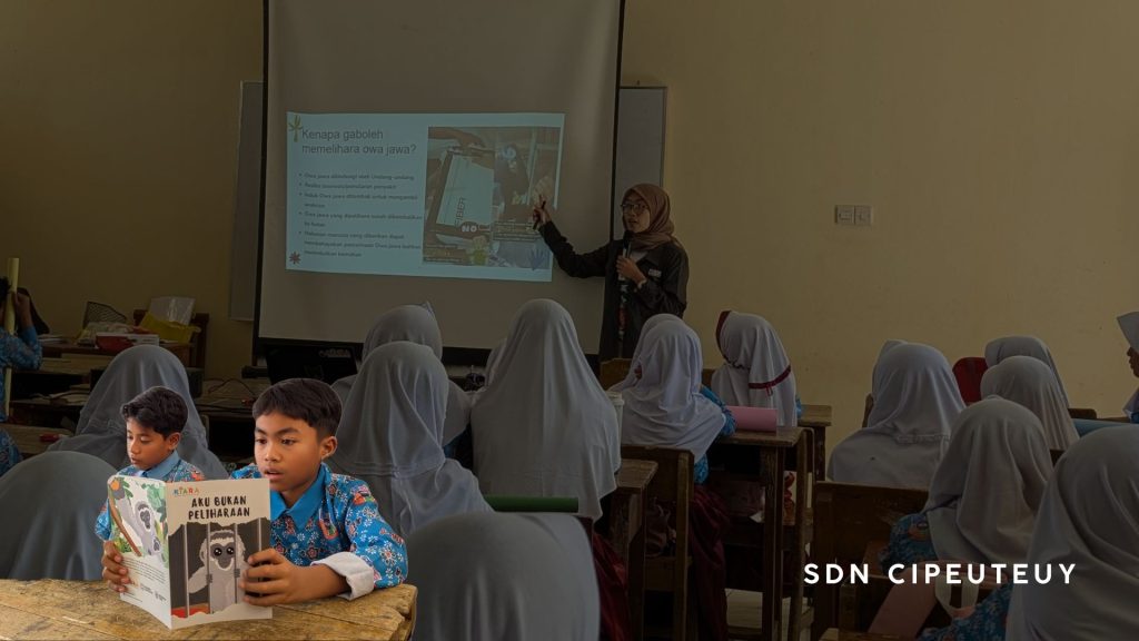 Pagi-pagi kami berangkat dari Bogor menuju SDN Cipeuteuy, selama perjalanan semuanya aman dan lancar. Bahkan, kami tiba satu jam lebih cepat. Di sekolah kami disambut oleh para guru dan diberikan kesempatan untuk berkegiatan di kelas 5-6. Waww, sangat ramai dan pastinya mereka sangat antusias sekali mau belajar. Saat menonton video tentang owa jawa, mereka tertawa karena pergerakan brakiasi owa jawa yang seperti akrobatik handal. Selama sesi penyampaian materi, mereka sangat bersemangat untuk menjawab pertanyaan-pertanyaan, bahkan mereka saling mengajak untuk menirukan suara owa jawa bersama. Beberapa dari mereka berani maju ke depan untuk menjelaskan jaring-jaring makanan dan bagaimana owa jawa kecil dipisahkan dari induknya dan dipelihara.