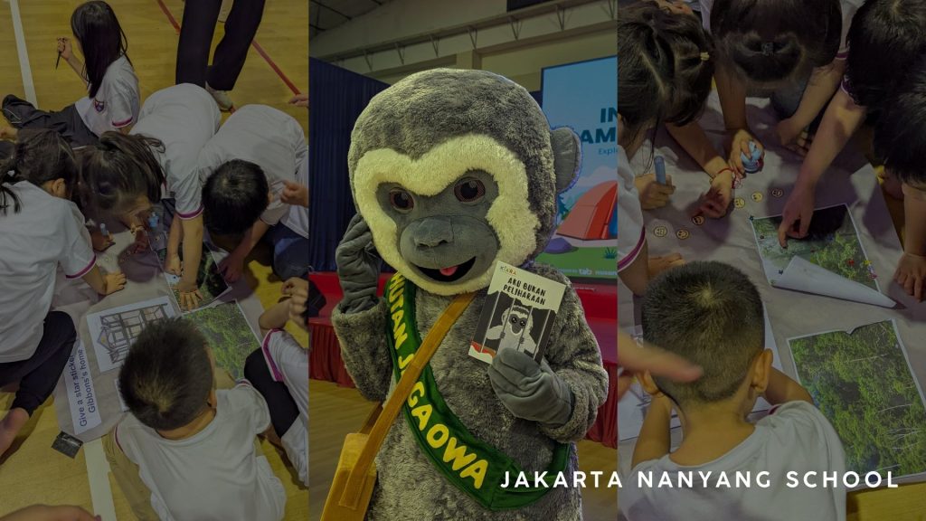 Sekolah selanjutnya ada di daerah Tangerang Selatan, cukup jauh dari lokasi kami di Bogor. Kurang lebih tiga jam kami menempuh perjalanan, tiba juga kami di sekolah Jakarta Nanyang School (JNY). Kami disambut oleh anak-anak yang sedang sangat antusias belajar tentang survival, outdoor activity bersama Rimba experiences kemudian anak-anak melanjutkan belajar tentang owa jawa bersama KIARA melalui pagelaran wayang owa & membaca buku ‘aku bukan peliharaan. Suasananya sangat ramai dan meriah